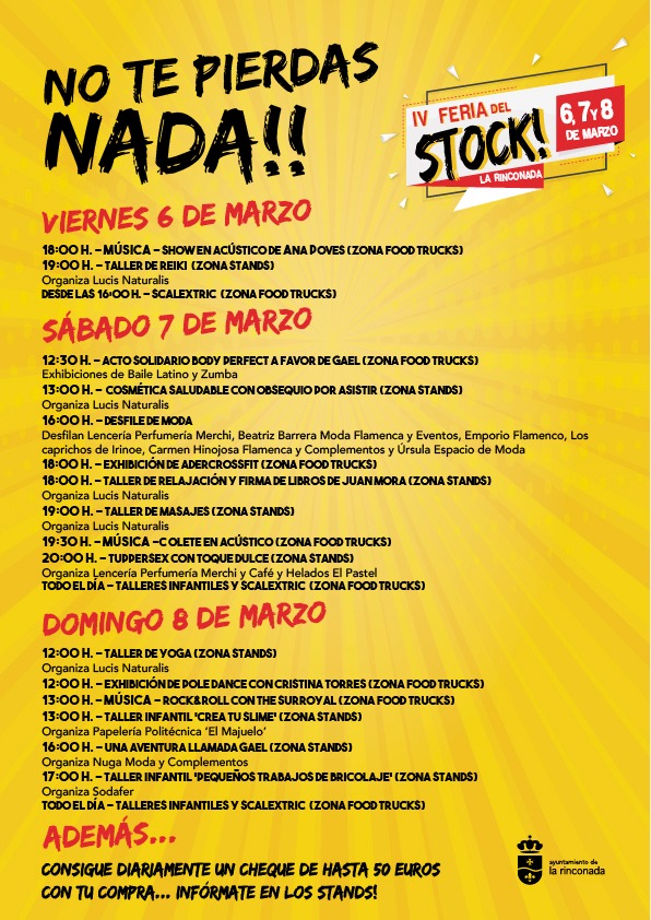 El primer fin de semana de marzo, el CEIP Maestro Antonio Rodríguez acoge la cuarta edición de la Feria del Stock de La Rinconada. En esta ocasión serán 28 las firmas que participen trasladando sus productos a los stands que conforman el evento, sacando el stock remanente tras las rebajas a la vez que se dan a conocer y adquieren nuevos clientes potenciales. El recinto albergará todo tipo de productos de diferentes sectores como moda, belleza, peluquería, informática, papelería, mascotas, decoración o alimentación, entre otros.