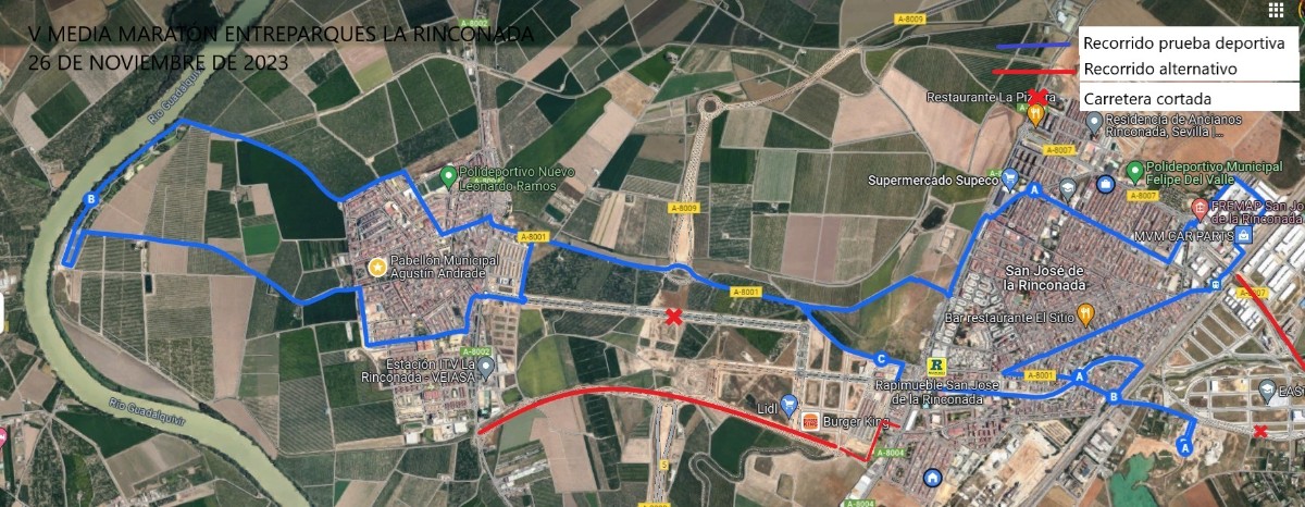 El Ayuntamiento de La Rinconada informa que con motivo de la celebración de la V Media Maratón Entreparques, el próximo 26 de noviembre, se producirán cortes de tráfico desde las 10:00 a las 12:30 horas en diferentes calles de los dos núcleos de población.