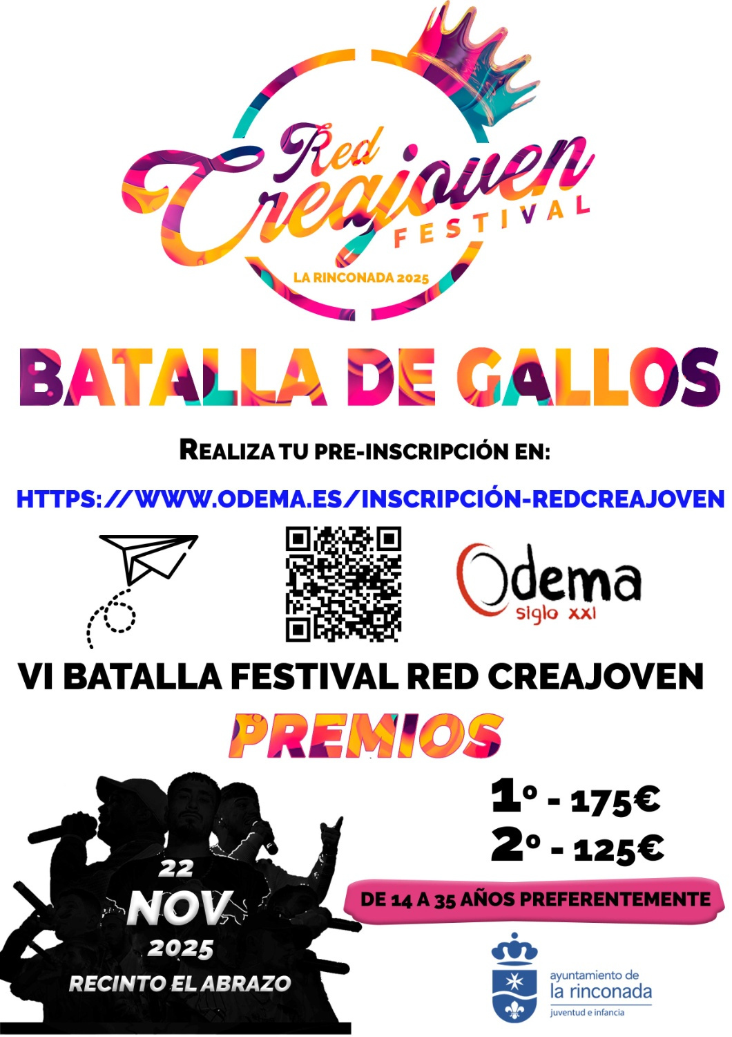 El Abrazo acogerá la próxima edición del Festival Red CreaJoven que cada año lleva a cabo el área de Juventud e Infancia y que implica numerosas actividades entre las que se encuentra el concurso Batalla de Gallos, que la delegación organiza junto a la empresa Odema S.XXI.