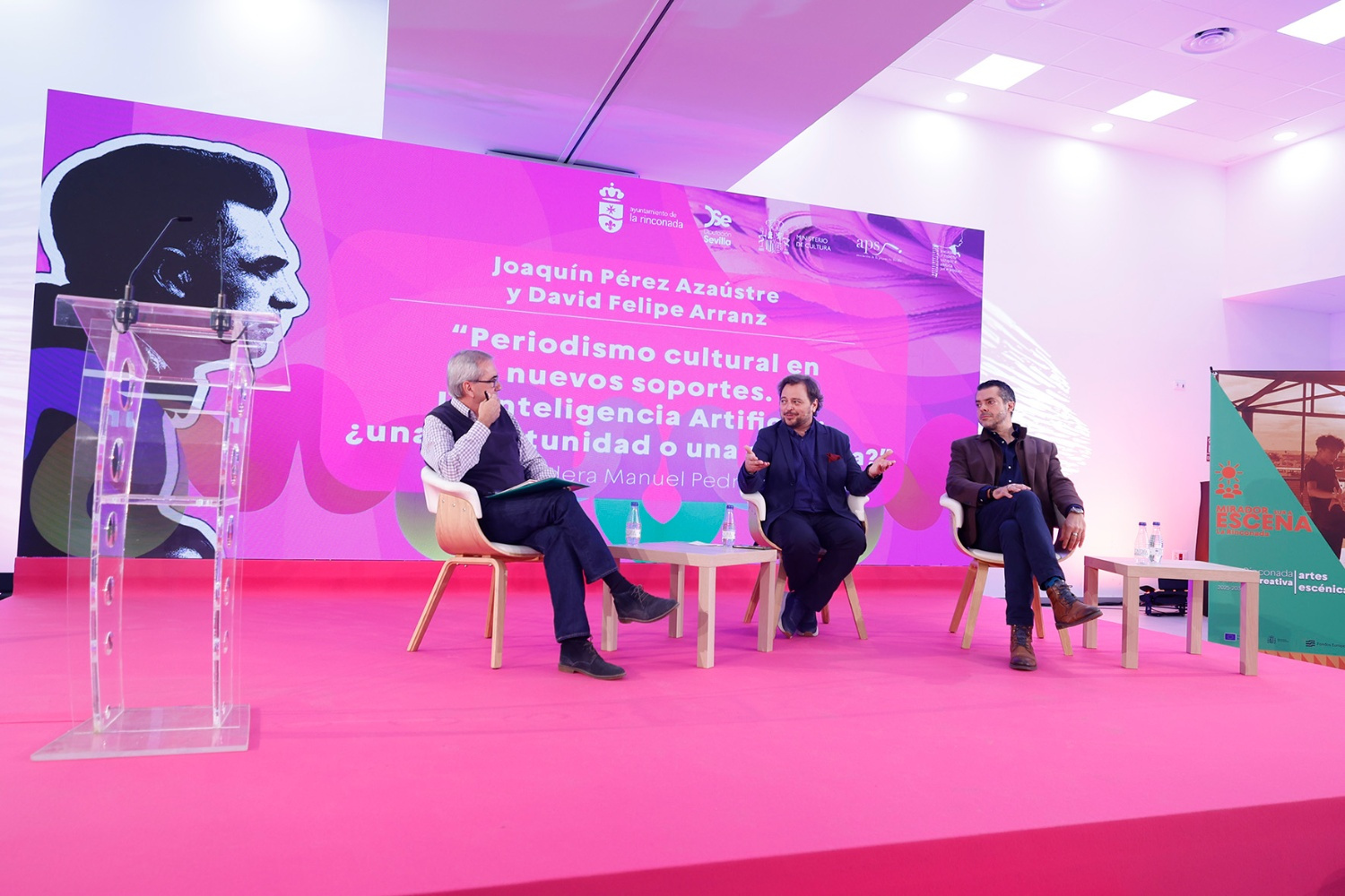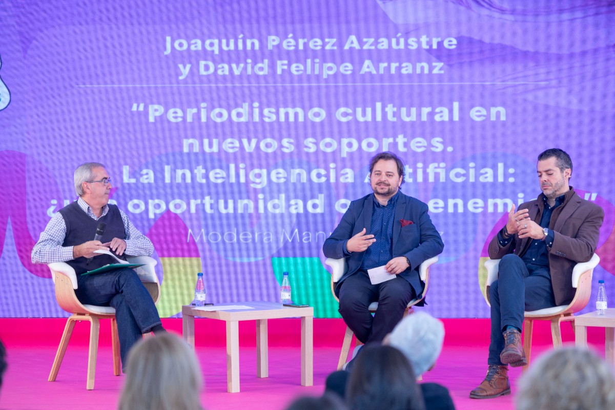 La segunda mesa de la mañana ha sido ‘Periodismo cultural en nuevos soportes. La Inteligencia Artificial: ¿una oportunidad o una enemiga?’ con Joaquín Pérez Azaústre escritor y periodista; David Felipe Arranz, especializado en cine y literatura, dirige el programa radiofónico ‘El marcapáginas’ y Manuel Pedraz, periodista y presidente de Presidente de la Asociación de Periodistas Culturales ‘José María Bernáldez’, que ha conducido el encuentro.