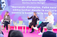 El segundo día de congreso ha dado inicio con la mesa ‘Narrando distopías. Fake news: cómo luchar desde la cultura contra la batalla de la mentira’ con Karina Sainz Borgo, periodista especializada en cultura en ABC y escritora; Winston Manrique Sabogal, periodista, fundador y director de WMagazín y Amalia Bulnes, periodista y asesora de comunicación cultural.