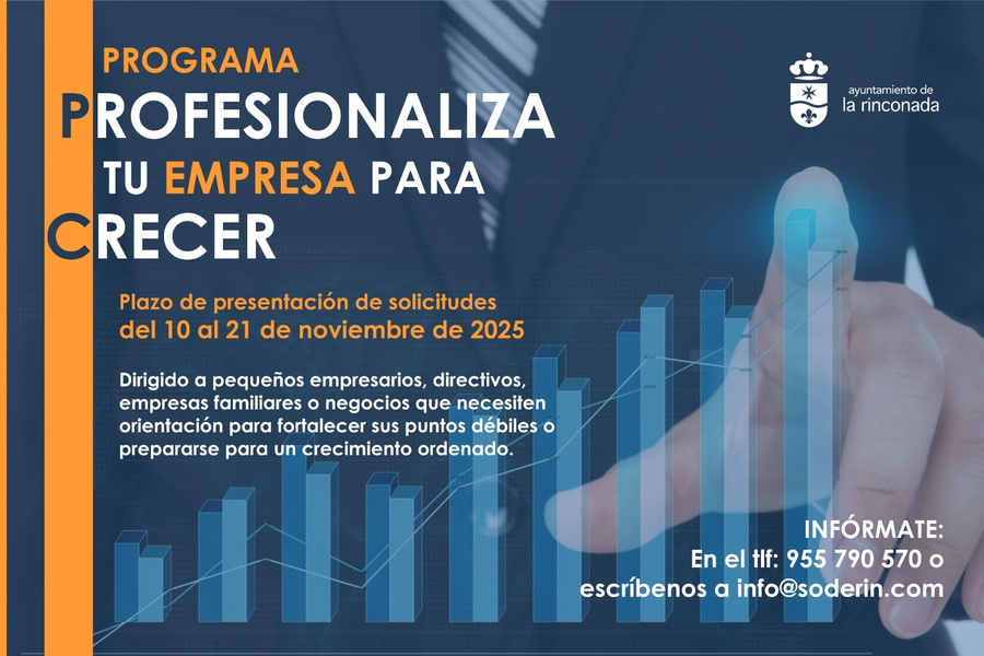 Se trata de un programa promovido por el Ayuntamiento de la Rinconada, para ofrecer una consultoría experta a las empresas de La Rinconada, trasladando y transmitiendo desde la experiencia como profesionalizar un pequeño comercio o empresa a través de un modelo de negocio ágil, moderno y rentable. Hasta el 21 de noviembre estará el plazo de solicitudes