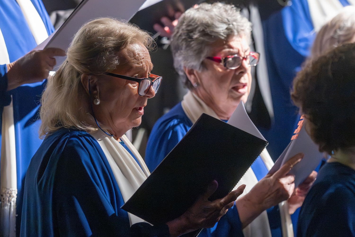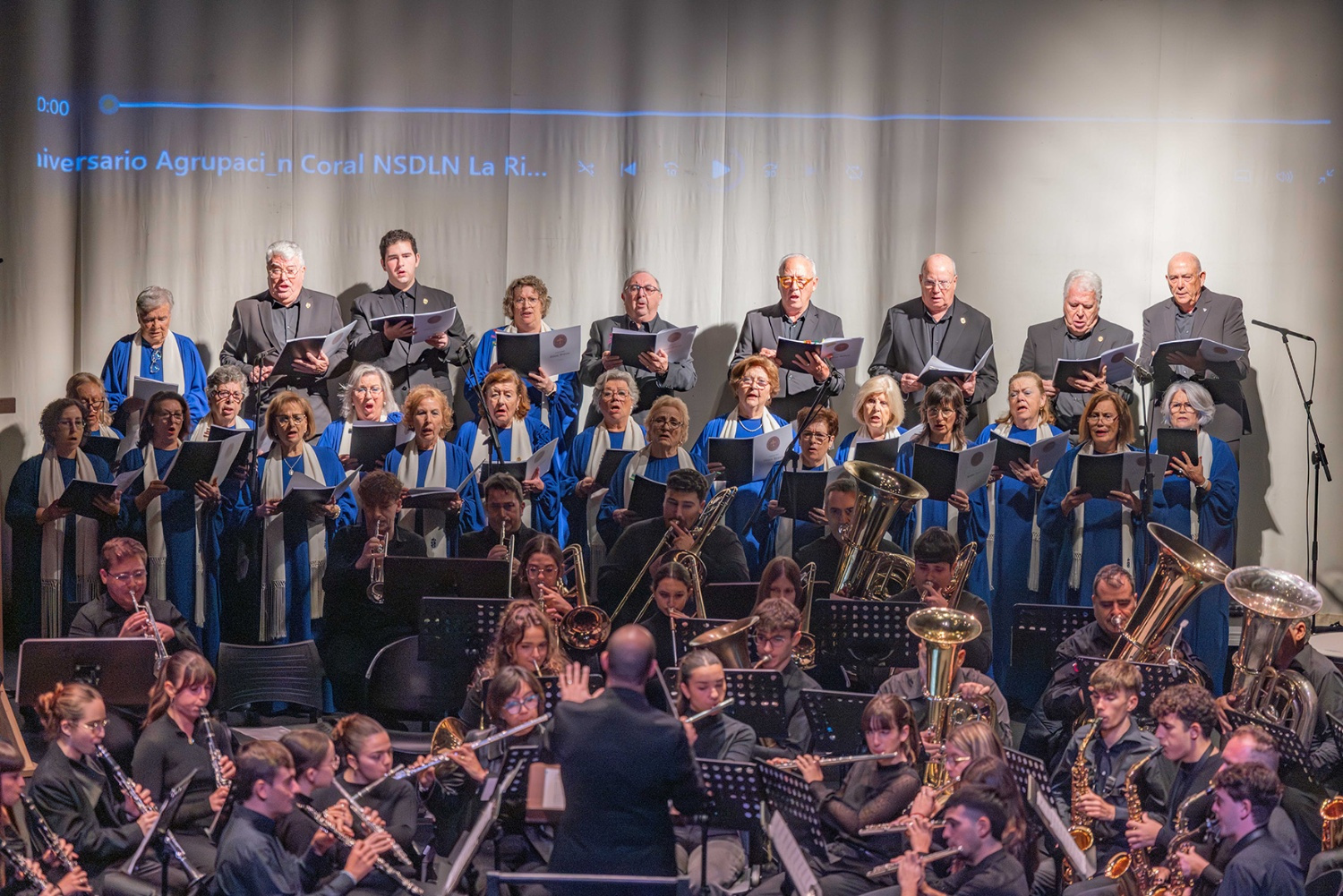Llegar a los 45 años de historia no es tarea fácil, implica compromiso, cooperación y amor por lo que se hace y, en eso, la Coral Nuestras Señora de las Nieves de La Rinconada tiene mucho que aportar. Cumple este 2025 más de cuatro décadas en las que ha elevado el canto y la música a altos niveles de calidad con múltiples actuaciones, tanto en el municipio, como en toda la provincia. Una efeméride que han querido conmemorar y que ha culminado con un concierto en el Centro Cultural de La Villa con la Banda Municipal Cristo del Perdón de La Rinconada acompañándola.