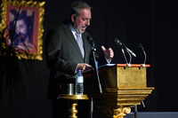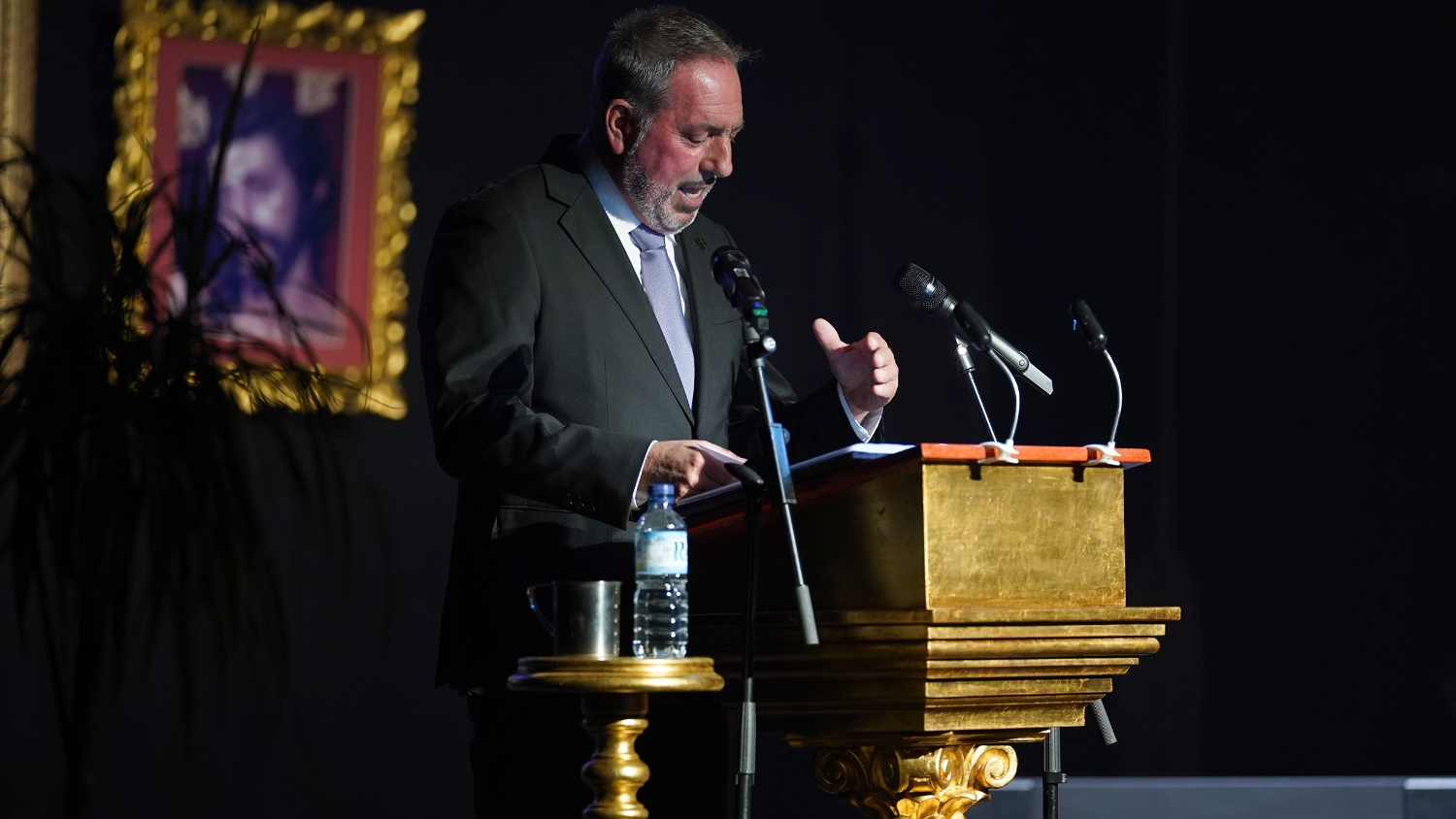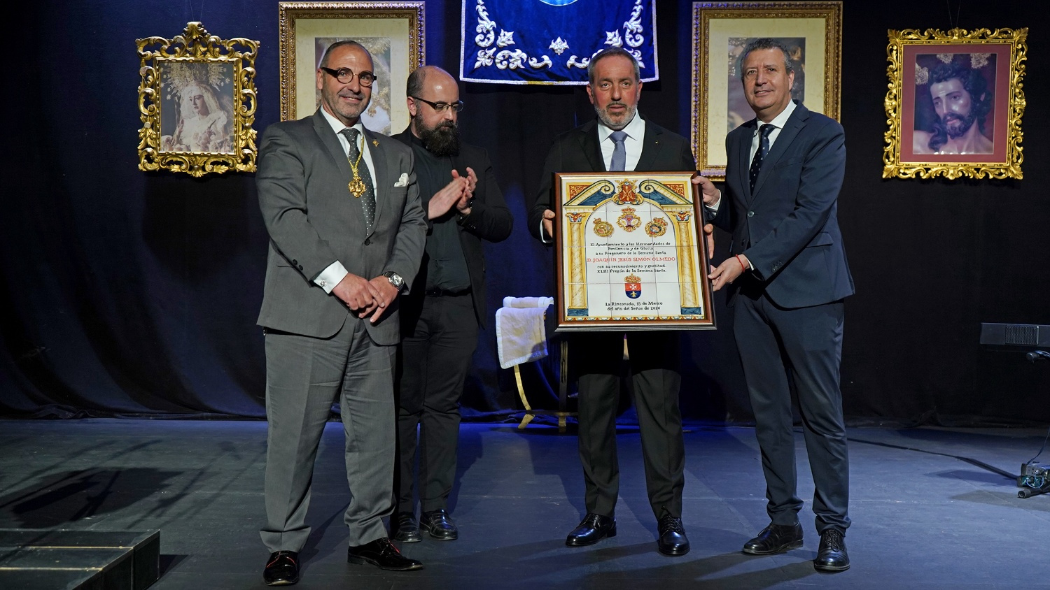 La escenografía estuvo marcada por un cuidado lenguaje simbólico, con las imágenes titulares de las cofradías rinconeras y elementos propios del universo cofrade, como costales, incienso, fotografías y bacalaos, en una puesta en escena que reforzó el carácter íntimo y devocional del acto, con detalles del jarrillo de lata para saciar la sed de este pregonero. La presentación corrió a cargo de José Ángel Navarro Porra, pregonero del pasado año, quien describió a través de una semblanza la figura de “Peluki”, dando un preámbulo de lo que sería un Pregón hecho y declamado “a corazón abierto”.