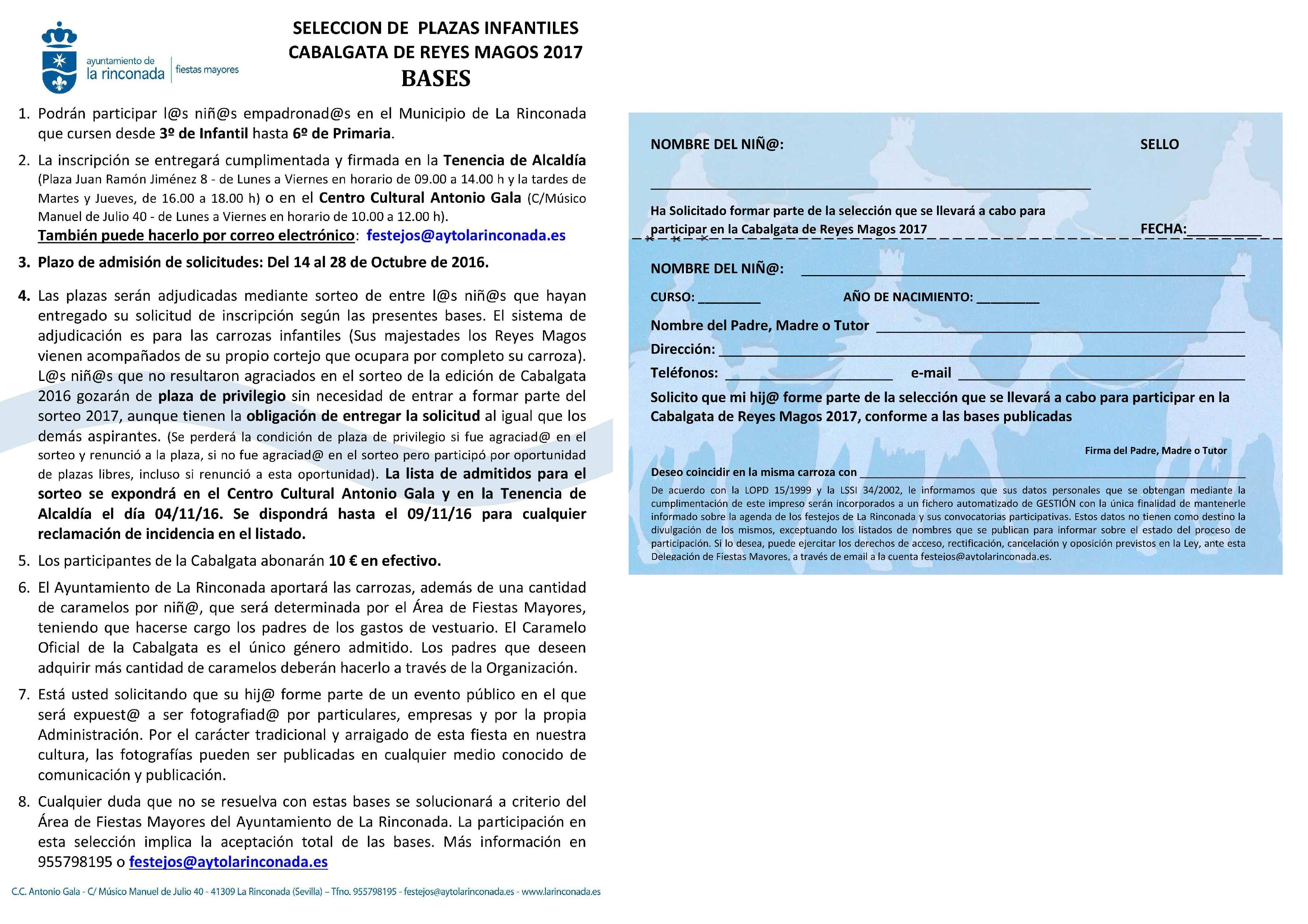 El área de Fiestas Mayores abre el plazo de inscripción, desde el 14 al 28 de octubre, para los niños y niñas del municipio que cursen desde 3º de Infantil hasta 6º de Primaria, y que deseen formar parte de la selección para participar en la Cabalgata de Reyes Magos 2017.