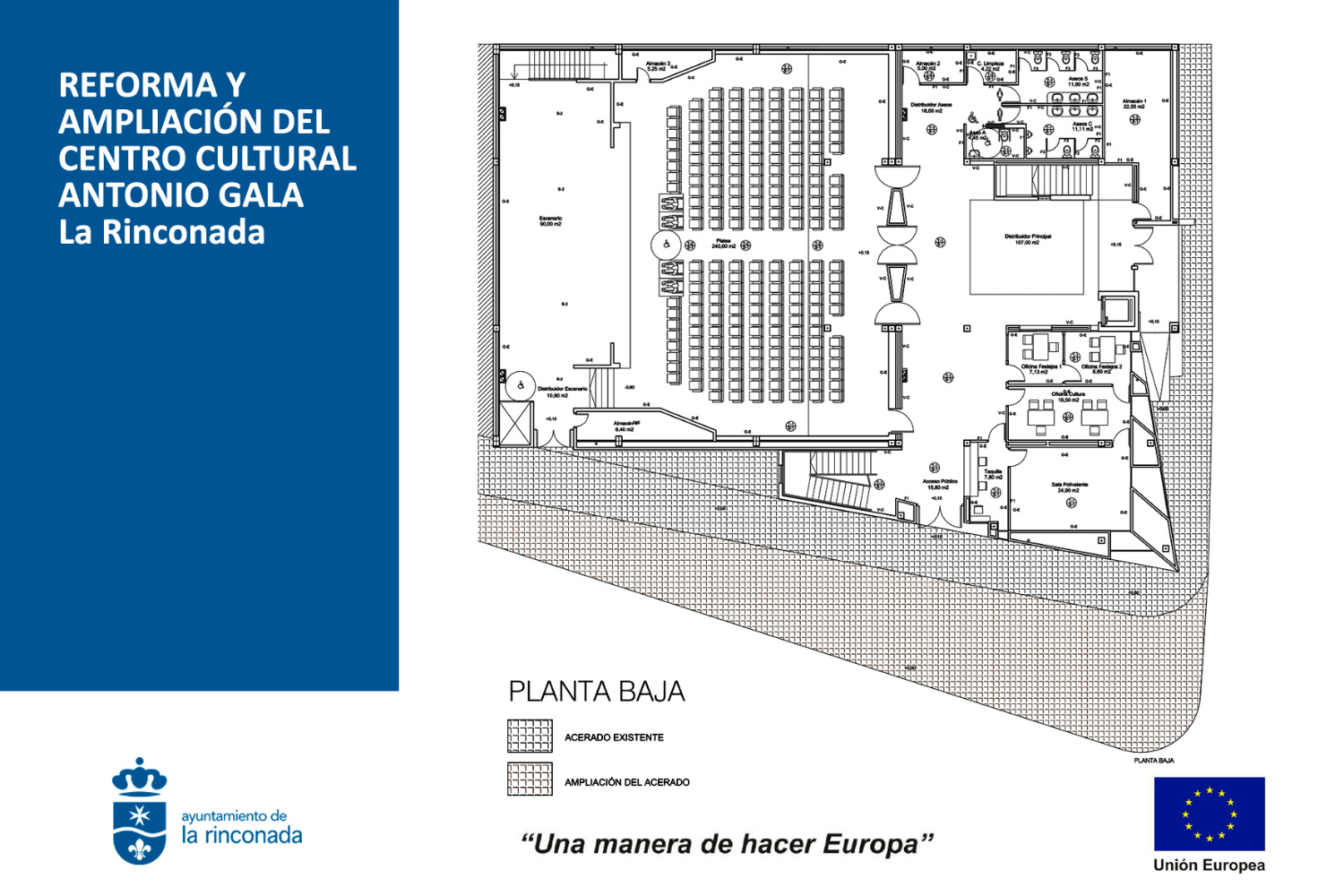 La Rinconada es cultura y el trabajo municipal en este sentido, no consiste sólo en programar un abanico de propuestas interesantes para la ciudadanía, sino que también hay que velar por el buen estado de los espacios escénicos de los que dispone el municipio. Dentro de esta línea de actuación se plantea un proyecto de mejora que va a permitir ampliar las posibilidades, la producción, la calidad y el disfrute del Centro Cultural Antonio Gala. Fue inaugurado el 10 de febrero de 1995 y alberga no sólo producción cultural referente al Ayuntamiento, sino también espacios cedidos a asociaciones y colectivos ciudadanos para que puedan preparar su actividad. Al tratarse de un edificio de más de 23 años, con el fin de adecuarlo a la demanda de uso actual, y a la necesidad de renovar instalaciones, se han proyectado obras de renovación y ampliación con un presupuesto de 530.000 euros, cofinanciados con fondos propios municipales y fondos de la Unión Europea a través de FEDER.