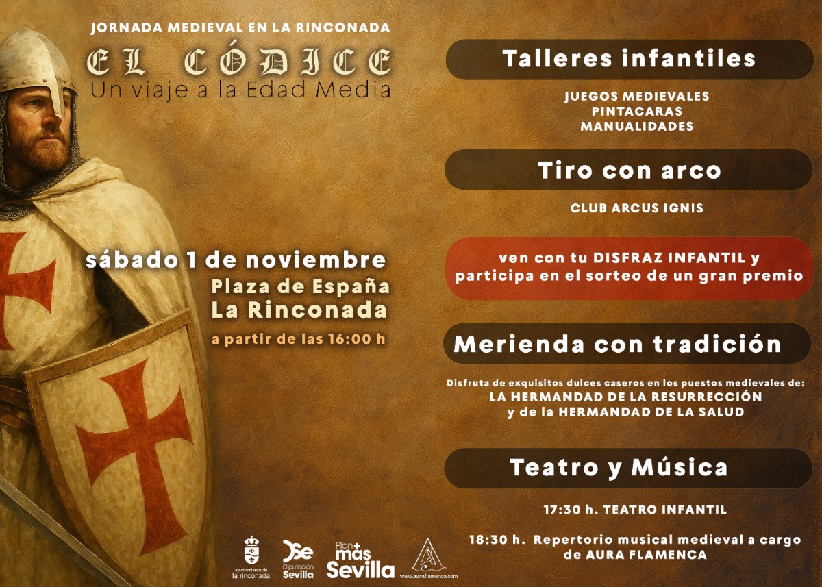 De nuevo, Aura Flamenca de la mano del área de Cultura y con la cofinanciación del Plan Más Sevilla de Diputación de Sevilla, propone un viaje a la edad media con una tarde llena de actividades para todas las edades. A partir de las 16.00 horas, habrá talleres infantiles, concurso de disfraces, cuentacuentos, gastronomía, una tómbola, una obra de teatro infantil y música con un repertorio de música medieval